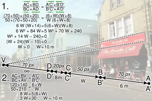 Ahora, podemos utilizar la conservación de la razón doble para determinar las longitudes de objetos en el mundo real a partir de sus representaciones perspectivas. En efecto, la relación entre el objeto en el mundo real y su representación perspectiva es una perspectividad, luego una homografía. Por tanto, cualesquiera cuatro puntos en un plano de la realidad y sus representaciones tienen que tener la misma razón doble. Usando que tanto el plano de la realidad como el de la representación son clausuras de espacios euclídeos, tenemos una ecuación que relaciona las distancias entre los puntos reales y las distancias de las representaciones de los puntos (la igualdad entre razones dobles). Por ejemplo, en la imagen de la derecha tenemos un ejemplo concreto.