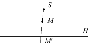 Dado un hiperplano del espacio proyectivo y un punto que no pertenece a , la proyección (o perspectiva) de centro y de base es la aplicación que hace corresponder a cualquier punto distinto de el punto de intersección de la línea con . Es una aplicación proyectiva, dado que es inducida por la proyección vectorial de base (que es un hiperplano de ) y dirección (que es una recta de ). |