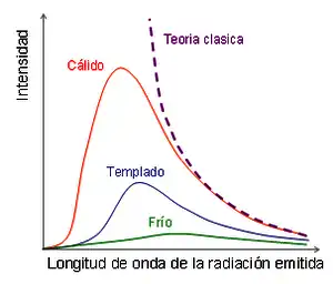 Para un radiador de 1500 K cuando la frecuencia se reduce a cero, el espectro predicho por la fórmula clásica de Rayleigh y Jeans se acerca más y más al espectro observado experimentalmente. Sin embargo, cuando la frecuencia se aumenta a valores de la región ultravioleta del espectro, el resultado teórico clásico difiere enormemente del experimento, ya que la “formula matemática” predice una densidad de energía infinita, cuando la densidad de la energía, a frecuencias muy altas, tiende a cero, lo que se llamó catástrofe ultravioleta.