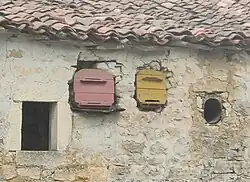 f) Colmenar con vivienda adosada en la parte superior.[7] Más frecuente que este caso era el de casas en las cuales se hacían un par de hornos en una pared para abastecer de los productos de la colmena a la familia.