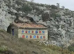 c) Colmenar rupestre aprovechando un saliente rocoso para evitarse la construcción de la cubierta y de alguna pared, por lo general la trasera y en ocasiones alguna lateral. Las paredes que no sean la propia roca, se construyen piedra a piedra hasta cerrar la hornillera, Se acostumbra a colocar en la pared frontal los dujos y a veces la puerta de acceso.[6]