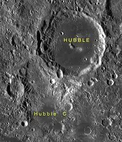Hubble es un cráter lunar que se encuentra muy cerca de la extremidad este-noreste de la Luna. Esta localización se observa con dificultad desde la Tierra y su visibilidad se ve afectada por la libración. Se encuentra al norte del Mare Marginis y al noreste del cráter Cannon. Alrededor de un diámetro del cráter hacia el norte-noreste está el cráter Lyapunov.