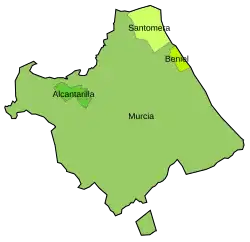 Así definida, la comarca natural comprende la totalidad de los términos municipales de Alcantarilla, Santomera y Beniel y la mayor parte del término municipal de Murcia. Algunas pedanías de Murcia se encuentran en la vertiente sur de la cordillera prelitoral. Esta zona incluye las pedanías de Baños y Mendigo, Carrascoy-La Murta, Corvera, Gea y Truyols, Jerónimo y Avileses, Lobosillo, Los Martínez del Puerto, Sucina y Valladolises y Lo Jurado y constituyen lo que en Murcia suele denominarse Campo de Murcia.[3] Geográficamente, este Campo de Murcia no pertenece a la comarca natural de la huerta de Murcia, sino a la del Campo de Cartagena, vertiendo sus aguas pluviales, no al río Segura, sino al Mar Menor por multitud de ramblas. Además, a diferencia del territorio que forma parte de la Huerta de Murcia, sus tierras eran en su mayoría de secano y no de regadío, aunque tras la llegada del Trasvase Tajo-Segura, la actividad agraria intensiva de regadío se ha ido trasladando paulatinamente a esta comarca dada su estructura de propiedad más amplia que el minifundio de la tradicional Huerta de Murcia.