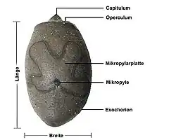 La morfología del huevo maduro es muy variada entre órdenes de insectos. Los planos de simetría dorso-ventral y cabeza-cola se evidencian en la morfología externa del huevo, y ya se observan desde su formación. Muchas veces se puede reconocer a qué insecto pertenece el huevo por su morfología externa (se dice que la morfología externa del huevo tiene “valor taxonómico”). A pesar de su variada morfología, aun así se reconoce un esquema generalizado del huevo que está muy conservado evolutivamente. El huevo en un esquema generalizado consta de un ovocito con nutrientes ("yema"), envuelto por la membrana vitelina (que contiene más nutrientes), y 4 capas de corion protector, cada una con sus características químicas, de adentro hacia afuera: la capa de ceras, la capa cristalina interna, el endocorion y el exocorion[nota 3]). Se llama cáscara al conjunto de las capas de membrana vitelina y corion.