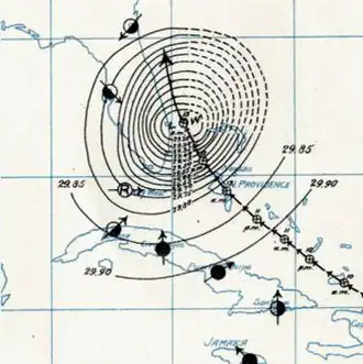 Análisis meteorológico de superficie del huracán de San Ciriaco el 13 de agosto de 1899 | ||