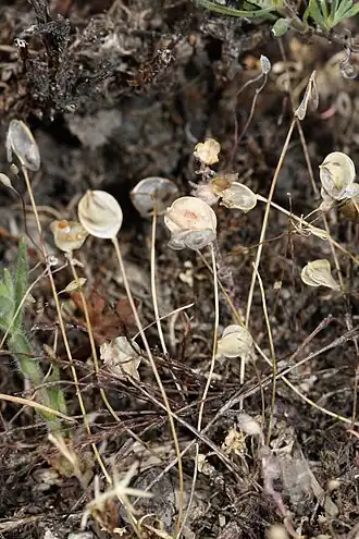 Es una hierba anual pequeña que crece de una roseta basal de hojas pecioladas de uno a tres centímetros de largo y lisa o lobulada a lo largo de los bordes. El tallo delgado erguido tiene una altura máxima cerca de diez centímetros. Cada uno soporta una sola pequeña flor con pétalos de color blanco sobre el color rojo-púrpura de los sépalos. El fruto es una cápsula plana y redonda con forma de disco o algo ovalada, y de 6 a 12 milímetros de ancho. Cuando la fruta verde se seca forma una capa de color gris o blanco.