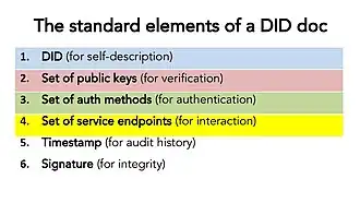 Los IDD son un tipo de identificador que permite una identidad digital verificable y descentralizada. [1] Se basan en el paradigma de auto-identidad soberana. Un IDD identifica cualquier sujeto (por ejemplo, una persona, organización, cosa, modelo de datos, entidad abstracta, etc.) que el controlador del IDD decida que identifique. Estos están diseñados para permitir que quien administre un IDD pueda demostrar su control, así como también implementar su uso independientemente de cualquier registro centralizado, proveedor de identidad o autoridad certificadora. Los IDD son URIs que asocian un IDD de sujeto con un IDD de documento, lo que permite interacciones confiables asociadas con ese sujeto. Cada IDD de documento puede expresar material criptográfico, métodos de verificación o puntos de servicio, que proporcionan un conjunto de mecanismos que permiten que un controlador IDD demuestre su control. Los puntos de servicio permiten interacciones confiables asociadas con el IDD de sujeto. Un IDD de documento puede contener semántica sobre el tema que identifica. Un IDD documento puede contener el propio IDD sujeto (por ejemplo, un modelo de datos). [3] [2]