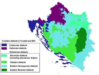 El idioma croata se subdivide a su vez en tres dialectos: Čakavski, Štokavski y Kajkavski. El čakavski es hablado en Istria, el golfo de Kvarner (Quarnero), el litoral de Dalmacia y en algunas regiones del centro de Croacia. El štokavski se habla principalmente en Dalmacia y Eslavonia, y por último, el kajkavski es hablado en el norte y noroeste de Croacia; siendo el primero el considerado más prestigioso y más hablado. La lengua croata también es hablada en Bosnia-Herzegovina, donde constituye constitucionalmente una de sus comunidades nacionales.
