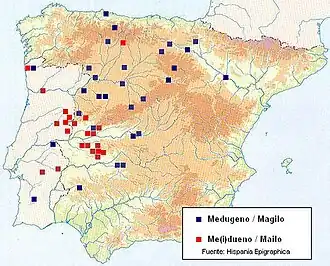 - Mailo (Évora, Cáceres) < *mh₂e(g)-ilo-. (entre los astures Magilo, y entre los célticos de Beturia Magilancum.). Maelgeino 'hijo de Mailo' < *mailgeno < *magilogeno.