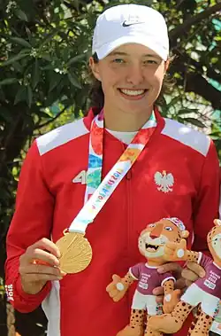 Iga Natalia Świątek[1] (pronunciación en polaco: /ˈiɡa ˈɕfjɔntɛk/ (Varsovia, 31 de mayo de 2001) es una tenista profesional polaca.[2] En abril de 2022 se clasificó como la n.° 1 del mundo en individuales femeninos de la WTA, ocupando el puesto durante un total de 125 semanas y ubicándose en el séptimo lugar en la lista de todos los tiempos por número de semanas en el número uno. Świątek ha ganado seis títulos de Grand Slam y convirtiéndose en la única jugadora polaca en alcanzar esta hazaña. Ha ganado Roland Garros cuatro veces, y el Campeonato de Wimbledon y el Abierto de Estados Unidos una vez cada uno. Świątek ha ganado 24 títulos individuales, incluidas las WTA Finals en 2023 y once WTA 1000. En 2024, se convirtió en la primera tenista polaca en ganar una medalla olímpica, obteniendo el bronce en individuales en los Juegos Olímpicos de Verano de París.