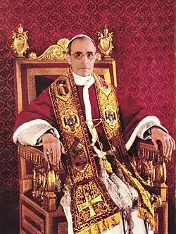 Pío XII, antiguo nuncio apostólico en Alemania, se convirtió en papa en vísperas de la guerra. Su legado es impugnado. Como secretario de Estado de la Santa Sede, abogó por la distensión a través del Reichskonkordat, con la esperanza de construir confianza y respeto dentro del gobierno de Hitler, y ayudó a redactar la encíclica antinazi Mit brennender Sorge. Su primera encíclica, Summi Pontificatus, llamó a la invasión de Polonia una «hora de oscuridad». Afirmó la política de neutralidad de la Santa Sede, pero mantuvo vínculos con la Resistencia alemana, la controversia que rodea sus reticencias a hablar públicamente en términos explícitos sobre los crímenes nazis continuos.[21] Utilizó la diplomacia para ayudar a las víctimas de la guerra, presionó por la paz, compartió inteligencia con los aliados y empleó a Radio Vaticano y a otros medios para hablar contra atrocidades como asesinatos de raza. En Mystici Corporis Christi (1943) denunció el asesinato de los minusválidos. Siguió una denuncia de los obispos alemanes del asesinato de los «inocentes e indefensos», incluidos «personas de una raza o descendencia extranjera».[22] Mientras el antisemitismo nazi abrazaba los principios raciales pseudocientíficos modernos, las antipatías antiguas entre el cristianismo y el judaísmo contribuían al antisemitismo europeo. Bajo Pío XII, la Iglesia rescató miles de judíos emitiendo documentos falsos, presionando los oficiales de las Potencias del Eje en la Segunda Guerra Mundial y escondiéndolos en monasterios, conventos, escuelas y otros lugares; incluyendo el Vaticano y Castel Gandolfo.