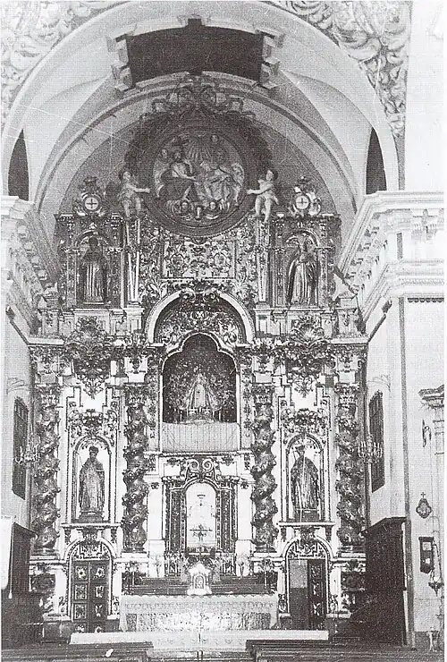 Tres retablos ocuparon el testero de la capilla mayor, antes del actual. El primero fue realizado en los años 1714-1719, y fue arrancado por los franceses en 1810 cuando José Bonaparte suprimió las órdenes religiosas, vendiéndolo por leña. El segundo fue uno de los colaterales que, salvado de la destrucción, se colocó aquí provisionalmente en 1814, pero como hacía mal efecto labraron un tercero, construido en 1832 por el maestro Joaquín Guijo, que colocó en el centro el medallón de la Santísima Trinidad que después se añadió al actual. Como no fue posible pintarlo ni dorarlo, en 1869 fue retirado y sustituido por el actual, retirando el del maestro Guijo a una aterazana de la sacristía.[10]