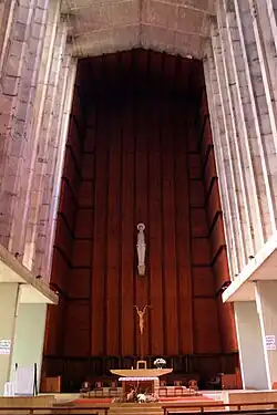 Su diseño, resultado de un concurso, está basado en el modelo de las basílicas orientadas hacia el oeste. Su forma es la de una tienda de campaña, con las paredes estiradas e inclinadas. Tiene 60 metros de largo, 26 de ancho y 26 de altura. A cada lado posé 24 troneras o ventanas de 17 metros de altura.