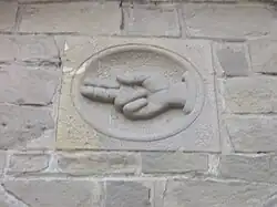 En el pórtico de entrada —que es también del siglo XX—, destaca la figura de una mano dando la bendición cristiana: tres dedos desplegados que representan la Trinidad, y dos encogidos que representan las dos naturalezas de Cristo (Divina y Humana).