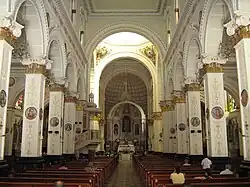 Con características de basílica, el templo está dispuesto en tres naves y una serie de arcadas. En la intersección de la nave central y la de crucero se origina la cúpula octagonal que se proyecta sobre la antesala del Altar Mayor. Este termina en un muro semicircular, cubierto por una bóveda de igual forma pero de menor altura. Las naves laterales están techadas a dos aguas y, a mayor altura, se encuentran las dos vertientes de la nave central y la de crucero. Ambas naves laterales culminan en sendos altares que dan lugar a los salones de la sacristía.