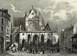 La fachada tiene un porche con cinco huecos de estilo gótico flamígero construido en 1435-1439 por Jean Gaussel, en un momento en que París estaba ocupado por los ingleses. Sin embargo, las estatuas de santos que se ven ahora, la mayoría copias de las obras originales, no se remontan más que al siglo XIX.