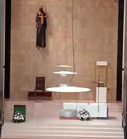 Una vez accedido al templo se encuentra el atrio en el que, en su parte izquierda, está la imagen de san Antonio de Padua, y a su derecha el acceso a la portería y a la vivienda de la comunidad capuchina. Una vez dentro del templo, se ven las imágenes del Padre Pío de Pietrelcina y en frente el Cristo de Medinaceli. El Vía crucis, obra del fraile capuchino y escultor Antonio Oteiza, se muestra como espacio de transición con las otras capillas laterales, donde se encuentran las de san Francisco de Asís y un Cristo crucificado. En las proximidades del presbiterio hay una imagen de la Inmaculada y enfrente la Santina.[3]