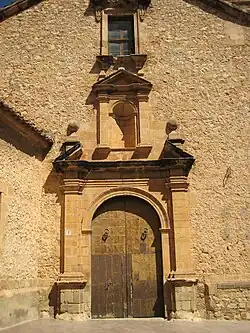 La portada principal, situada a los pies de la iglesia, presenta una apertura de medio punto con arco moldurado, flanqueada por pilastras dóricas que sostienen un entablamento sencillo, sobre el que descansa un frontón partido, el cual tiene bolas en los extremos y una hornacina en el centro, está flanqueada por pilastras dóricas que soportan un frontón, coronado por pináculos. Por encima, para iluminar la nave y para dar más verticalidad a la portada, una ventana moldurada perimetralmente, con un alféizar sostenido por ménsulas, formando una cornisa, y por encima del dintel, otra cornisa, también sostenida por ménsulas, que sostiene un frontón circular.