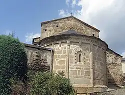 El ábside construido en la parte este, está ornamentado con un friso de dientes de sierra y cornisa sostenida por ménsulas intercaladas entre medias columnas con capiteles adosadas (lesenas) desde la base del ábside hasta el friso. La ventana centrada realizada con dovelas decoradas con medias bolas, tiene una arquivolta con representaciones geométricas y de rostros humanos.