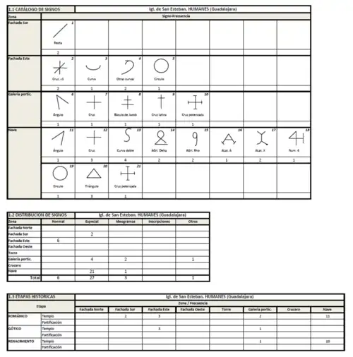 Se han identificado un total de 34 signos de 17 tipos diferentes situadas en el interior y exterior del templo, que se distribuyen de la siguiente forma: