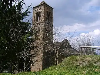El exterior está decorado con un friso de ventanas ciegas que, en la zona del ábside, se encuentran bajo unas arcuaciones lombardas. El campanario, de planta cuadrada, es de dos pisos enmarcados por arcuaciones en las que se abren las ventanas que están partidas por una columnilla. Los pisos están separados mediante frisos de dientes de sierra.