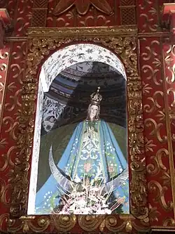 Hacia el interior la iglesia gira entre una austeridad franciscana y la estética de la restauración de 1992 con la conmemoración del V Centenario del Descubrimiento de América, donde destacan los grupos escultóricos del retablo mayor de San Francisco, de tres cuerpos y cinco calles con predela, el arco toral hojillado en oro y sobre grandes pilastras y capiteles corintios, el púlpito sobre el lado del Evangelio, el grupo escultórico de la Crucifixión, el Altar de los Pelícanos, en madera noble que es una de las mejores muestras iconográficas del simbolismo de la pasión de nuestro Señor y el camarín de la Inmaculada Concepción, con una profusión de decoración pictórica en vivos colores azules, blancos y rojos.