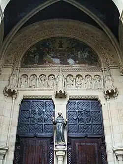 La portada bajo el atrio presenta, en su parte superior, un tímpano con un mosaico veneciano que representa la muerte de San Francisco de Asís y bajo él, en altorrelieve a modo de friso, seis figuras de santos enmarcadas por arquillos de medio punto. Este conjunto presenta un innegable sabor neorrománico, que unido al estilo neogótico predominante en el edificio permite matizar el estilo general de este como ecléctico. En la parte superior de la portada destaca, sobre el parteluz, una estatua policromada del patrón de la parroquia, obra de Higinio Basterra. Una puerta doble central y dos puertas laterales, talladas en madera, dan acceso al templo.