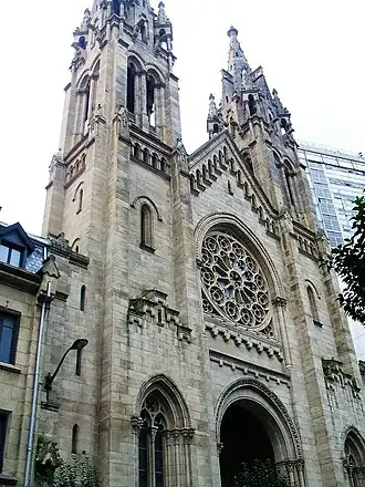 El exterior de la iglesia presenta en su fachada principal un rosetón central. Las torres gemelas que rematan su altura en flecha o aguja subrayan la verticalidad de todo el edificio. El atrio se encuentra situado en un plano elevado sobre el nivel de la calle; se accede al mismo por unas escaleras y lo cierra una verja trenzada de hierro forjado. El pórtico exterior se construye en arco de medio punto, con trasdós ligeramente apuntado.