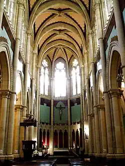 La iglesia posee una interesante colección de vidrieras policromadas repartidas por las diversas partes del templo. Su diseño y construcción se encargaron a una artesanía alemana de Múnich. Las más notables, por sus dimensiones y por la calidad de su colorido, se encuentran en las partes elevadas de todo el perímetro de las paredes. En el cuerpo central hay 17 juegos de vidrieras, 12 a ambos lados de la nave y las cinco restantes en el ábside. En total aparecen 52 figuras de santos y padres de la Iglesia, agrupados de cuatro en cuatro, salvo las más próximas al altar mayor, que forman sendos grupos de dos. Están enmarcadas en los espacios intercolumnarios formando ventanales de tracería bi y trilobulada.