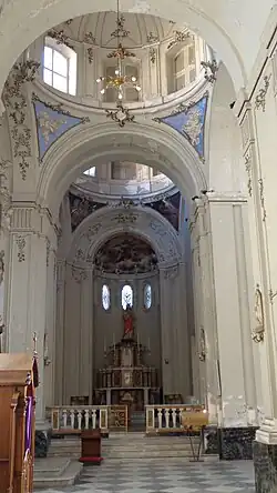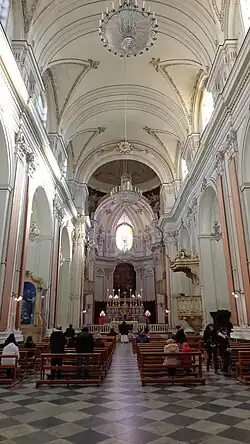 El interior de planta basilical de cruz latina se divide en tres naves divididas por seis pilares y con suelo de mármol con cuadrados blancos y azules. El aparato decorativo de estuco fue realizado por Giuseppe Gianforma con la colaboración de su hijo Gioacchino y los toques finales del yesero Filippo Cunsolo.