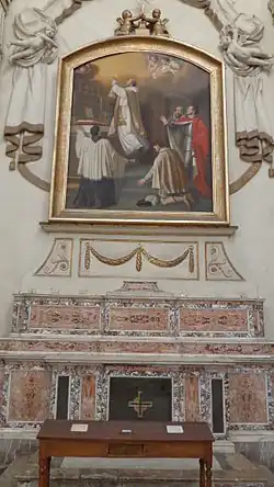 Sobre el altar de mármol policromado, la tapa del copón está realizada con un mosaico de lapislázuli sobre base de oro cincelado, obra de Paolo Guarna de 1574. Los frescos son obra de Francesco Sozzi, el cuadro que representa Indulgencia de la Porciúncula constituye un retablo.