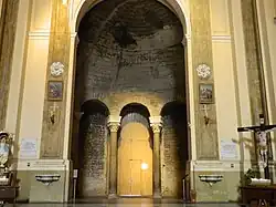 La entrada principal se abre a través del antiguo ábside de la basílica paleocristiana, que tenía tres arcos apoyados sobre dos columnas antiguas de capiteles corintios y monogramas cristianos.