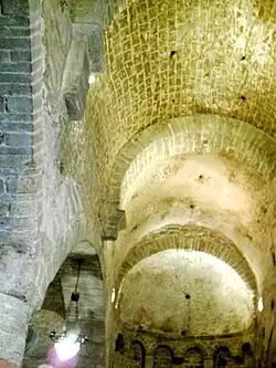En el interior del templo se conserva una pila bautismal monolítica, sin decoración, en forma de gran copa ovoide, actualmente colocada en la absidiola meridional.[2]