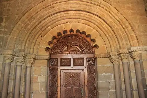 La iglesia presenta una imponente portada románica, formada por un arco polilobulado y tres arquivoltas decoradas con rombos, ajedrezados, perlas y dientes de sierra. Las arquivoltas descansan sobre una imposta también labrada con bandas de ajedrezado. Se apoyan en seis capiteles dispuestos en derrame los que se tallan motivos típicos del románico. Están decorados con aves, apomados,[n 1] dos animales luchando y una cabeza bovina engolada.[n 2] En el extremo norte del cabildo se conservan los restos del antiguo tejaroz que completaba esta portada y que por motivos desconocidos se decidió no incluir en su rehabilitación. Entre ellos destaca la cenefa de rosetas de la cornisa y la figura monstruosa que decora uno de los canecillos.