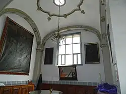 Sencilla, decorada con pinturas virreinales, y muros blancos, 2 bóvedas con linternilla, decoradas con chapa de oro, así como muebles con detalles franciscanos, 3 credencias y una mesa con sítulas.