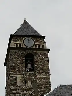 El campanario románico y modificado en el siglo XVII, de 31,97 metros de altura, es una torre de planta cuadrada formada por cuatro cuerpos situada a los pies de la iglesia encima del coro. La celda tiene cuatro ventanas de arco de medio punto, una en cada pared, de donde cuelgan las campanas; está rematada por un patio cubierto, con una balaustrada y un reloj de esfera.[1][3]