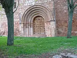 Los parámetros de la nave, presbiterio y ábside son de mampostería reforzada con sillares en aristas. A los pies destaca una moderna espadaña, de tres vanos, para alojar campanas. Toda la cornisa decorada con bolas, descansa sobre canecillos tallados con diversos temas y roleos escalonados. Orientada al sur, como es habitual, y en el centro de la nave, se abre la puerta de acceso mediante cinco arquivoltas de arco de medio punto, decoradas con puntas de diamante, discos hundidos, espigas enlazadas y ramajes ondulantes. Los arcos gravitan sobre fustes y capiteles de tosca factura, que reproducen animales afrontados. Dos impostas corridas, decoradas con billetes y bolas, separan la arquería de los soportes que le completan.[1]