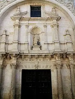 La fachada principal se concibe con el gigantismo característico del barroco, con grandes columnas y pilastras de orden corintio, remates en bolas y frontón partido por una ventana, sobre el que se abre una hornacina con el santo titular. Dos grandes escudos flanquean la portada. Es singular la solución arquitectónica de situar la torre, un macizo prisma más ancho que largo, de manera que prolongue la fachada en uno de sus lados que a su vez es rematado con una espadaña. No puede hablarse propiamente de estilo barroco jesuítico, que es más sobrio y puro de líneas, además de ser su desarrollo en España unas décadas anterior a la construcción del templo burgalés.