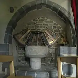 En uno de los contrafuertes meridionales del presbiterio hay un fragmento de estrella funeraria romana, un bloque de mármol blanco con una moldura de tipo clásico en uno de los extremos.[1]