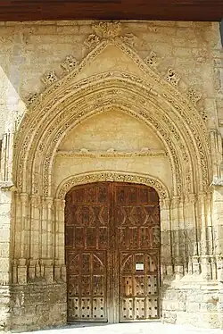 La torre, salvo el cuerpo inferior, que conserva la sillería medieval, fue reedificada en ladrillo macizo, al estilo mudéjar, adosada a la cabecera. La puerta principal de acceso se localiza en el lado de la Epístola (sur), y se abre al exterior a través de un elegante aunque deteriorado arco de estilo gótico-isabelino, con intradós carpanelado, tímpano vacío y trasdós conopial festoneado con cardinas y rematado en cogollo. Se halla este último elemento decorativo mutilado, al igual que las pilastrillas laterales, a las que les falta el cuerpo superior. En el pavimento del pórtico aparece una fecha, 1580. Se sabe que el maestro cantero Vítores trabajó en esta obra.