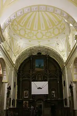 La planta es de tres naves, siendo más elevada la central que las laterales, y consta de seis tramos más una cabecera rectangular. Diez pilares de fuste prismático soportan unas cubiertas que la reforma barroca acometida en el siglo XVII convirtió en falsas bóvedas de arista, enlucidas y molduradas. El falso crucero, ante el Presbiterio y la Capilla Mayor, fue cubierto con una cúpula gallonada decorada con yeserías y apoyada sobre pechinas, en las cuales se colocaron relieves de cuerpo entero de los cuatro Evangelistas. Se considera al artista paredeño Felipe Berrojo de la Rúa autor de este trabajo.