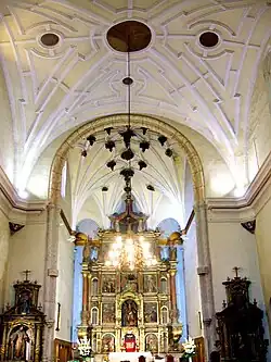 El autor del retablo de la capilla fue Leonardo de Carrión y data en 1567. Consta de banco con escenas de Santiago Matamoros y la Imposición de la casulla de San Ildefonso, y de dos cuerpos flanqueados por dos enormes columnas, apoyadas sobre mensulones sustentados por atlantes con relieves que representan las escenas de la Venida del Espíritu Santo, Jesús en el Pretorio, el Despojo, el Llanto sobre Cristo muerto y la Flagelación. En la calle central del retablo, reformada en el siglo XVIII, hay una escultura del santo arcángel titular, y en el ático, la escena del calvario flanqueada por los relieves del Descendimiento y el Santo Entierro. Por su parte, en los extremos se encuentran las alegorías del Antiguo y Nuevo Testamento. Finalmente, remata el conjunto un dosel descubierto por dos ángeles.