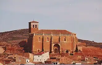Construida en una loma de terruño, sobre el solar que ocupaba el antiguo castillo, destaca por encima de todo el caserío del pueblo, con su color de piedra rojiza. Todavía conserva parte de su primera muralla, fosos y torre ( su parte más antigua) sobre la que hoy se asienta el campanario. Estos serían los restos de la citada fortaleza romana y posteriormente castillo medieval. Restaurada recientemente por la Diputación General de Aragón, se ha hecho incidencia en la reparación del campanario, tejado, ventanas y contrafuertes. Destaca la arquería que remata la torre y los elementos renacentistas de su portada, lo que la convierte en una de las más hermosas iglesias de la cuenca del Jalón.[2]