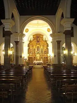 La iglesia se divide en tres naves, separadas por arcos de medio punto que descansan sobre fragmentos de entablamento y pilares cruciformes de granito, crucero y presbiterio. Las naves laterales se cubren con techumbres de madera a un agua y la central con alfarje decorado por casetones con rosetas. El crucero tiene cúpula sobre pechinas con linterna y los brazos del crucero van cubiertos por bóvedas de cañón con lunetos, al igual que el presbiterio.