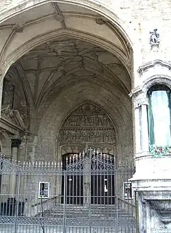 El pórtico actual es del siglo XVI y se superpone a la fábrica anterior. Cubierto por bóveda de crucería estrellada tardogótica, se accede al mismo por una amplia escalinata y a través de dos grandes arcos gemelos, ligeramente apuntados. El conjunto se abre a la plaza de la Virgen Blanca, patrona de la ciudad de Vitoria, cuya imagen se cobija en una recia hornacina de mármol entre los dos arcos de acceso. La hornacina es del XVIII y la talla es un bulto gótico de piedra policromada con la Virgen en majestad sosteniendo al niño.