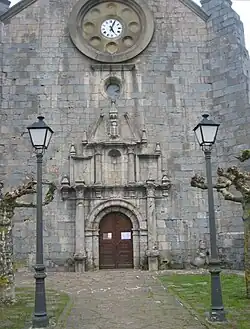 Al exterior, la fachada de sillar culmina en piñón, flanqueada por pináculos, en cuyo centro se sitúa el reloj y culmina con una torrecilla cuadrada. En la parte inferior de la fachada se conserva la portada de finales del siglo XVII, de estilo barroco clásico realizada por el cantero Juan de Mihura en 1699.[5] El sillar deja ver en el lado del Evangelio grandes lienzos de muro cada uno con óculo separados por un contrafuerte y el saliente brazo del crucero.