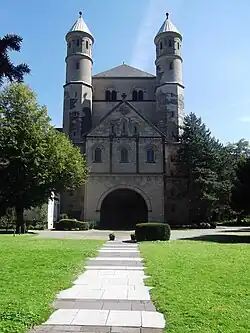 ![]() El macizo occidental o westwerk: en el centro, una gran torre cuadrada hueca en el interior, flanqueada por 2 torretas de escaleras; y un nártex, es decir un porche abierto delantero. | ||