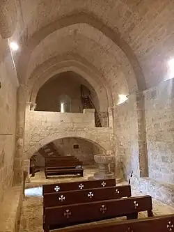 Dos ventanas abocinadas iluminan el interior: una ventana de arco apuntado en el eje del ábside y la otra de arco de medio punto en los pies del templo. En el lado de la epístola del presbiterio se sitúa la sacristía de planta cuadrada y cúpula rebajada, labrada a finales del siglo XV,[3]
