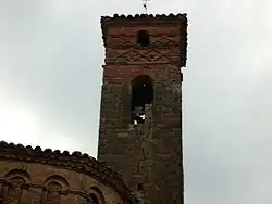 Adosada al presbiterio está la torre campanario románica, destacando de esta una ventana geminada con parteluz formado por columna y capitel decorado con motivos geométricos, que se abre en el lado norte. El último tercio de la torre remata en un recrecimiento en ladrillo de estilo mudéjar que sustituyó a la primitiva parte superior en la reforma del siglo XVII, aquí también es donde se encontraba la maquinaria del antiguo reloj. Está parte tiene una sencilla decoración a base de rombos, lo que es muy raro que en pleno siglo XVII se sigan usando elementos mudéjares por lo que es extraño e interesante a la vez, porque es el único ejemplo de decoración mudéjar a base de rombos tan al norte del Ebro.