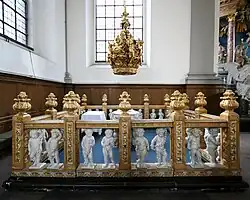 La base del retablo y las estatuas alegóricas son de mármol italiano. Las columnas son de mármol francés y el resto del retablo es principalmente de madera y estuco. Las esculturas fueron esculpidas por Abraham Breusegem y Emmanuel Cuekelaer, ambos empleados de Thomas Quellinus, quien parece haber modelado las figuras. En algunos aspectos el diseño de Tessin fue modificado. De acuerdo al modelo original, sobre cada segmento del frontón había dos ángeles que sostenían una gran corona real, y en el grupo escultórico central, Jesús se hallaba con las piernas estiradas y el ángel con las alas desplegadas. Posiblemente los cambios se realizaron para reducir peso y ajustar el balance. Detrás de la escena central, había originalmente un paisaje que representaba al monte de los Olivos, pero fue modificado con el fondo azul actual en 1773.